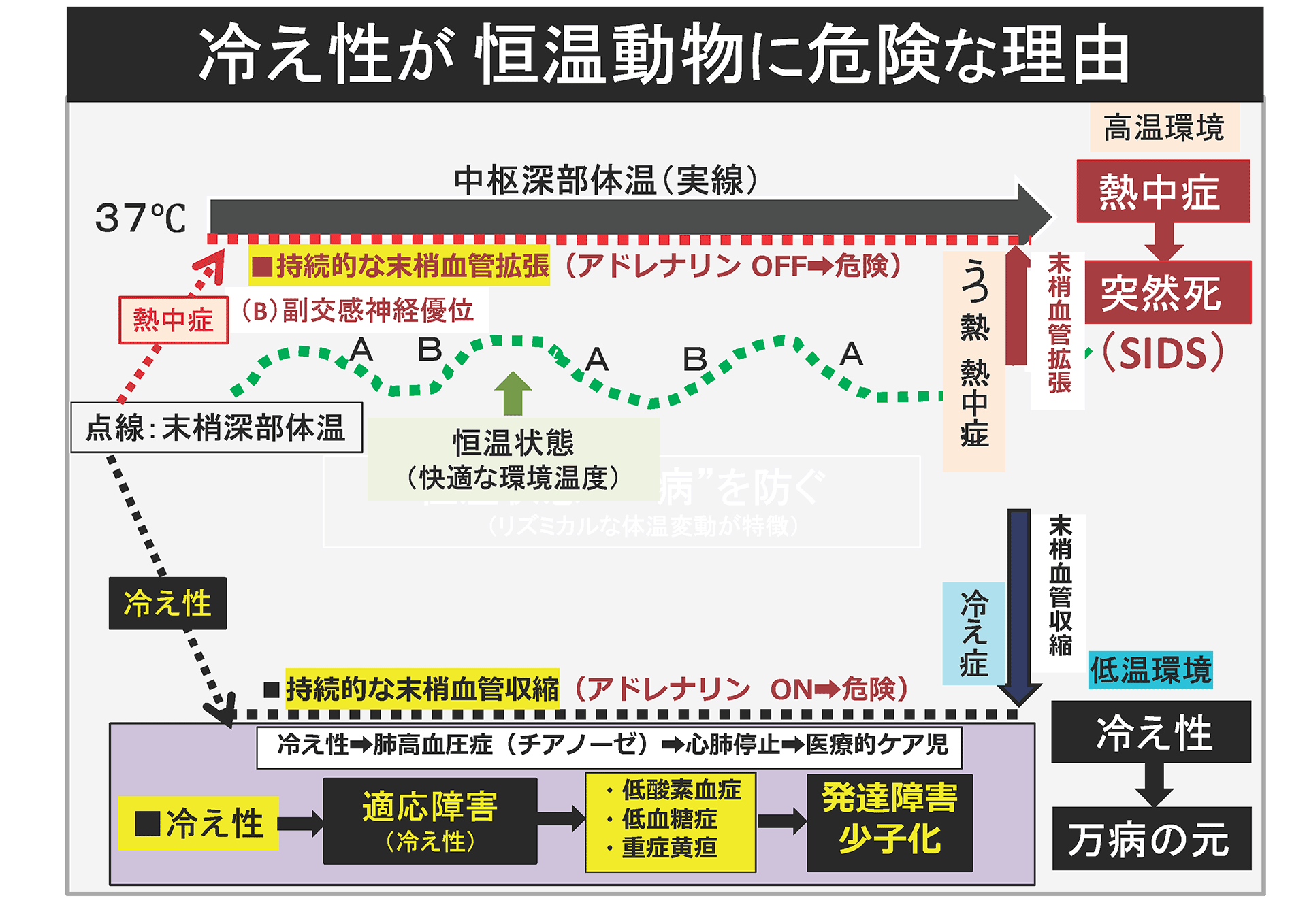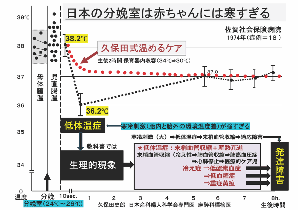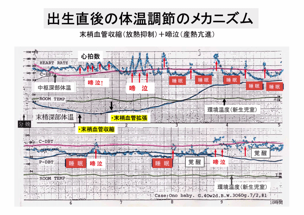 とくに出生直後の赤ちゃんは、胎内38℃から分娩室25℃前後への急激な寒冷刺激にさらされ、低体温、末梢血管収縮、低酸素血症、低血糖症、重症黄疸へと連鎖しやすく