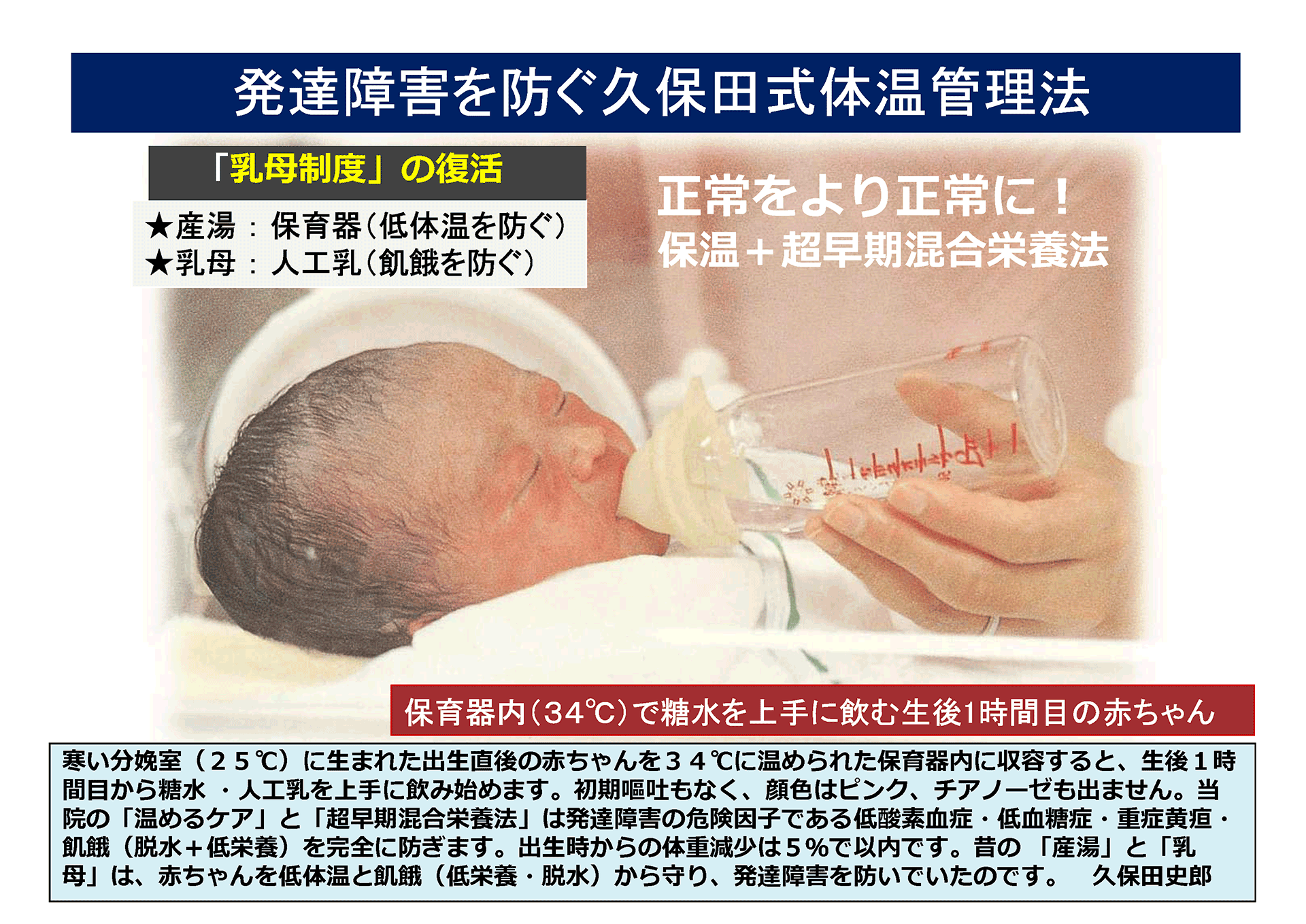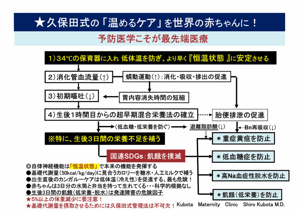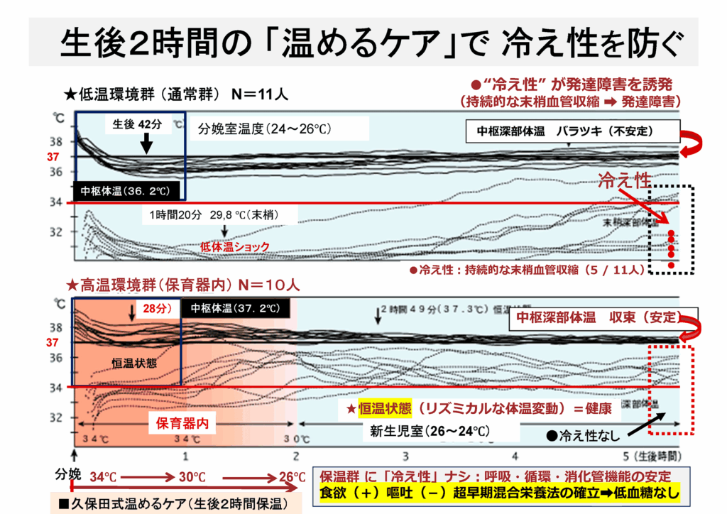 なります。私たちはこの連鎖を「生後2時間の温めるケア」と超早期混合栄養法で断ち切り、呼吸・循環・消化・代謝を恒温状態へ導くことを重視します。