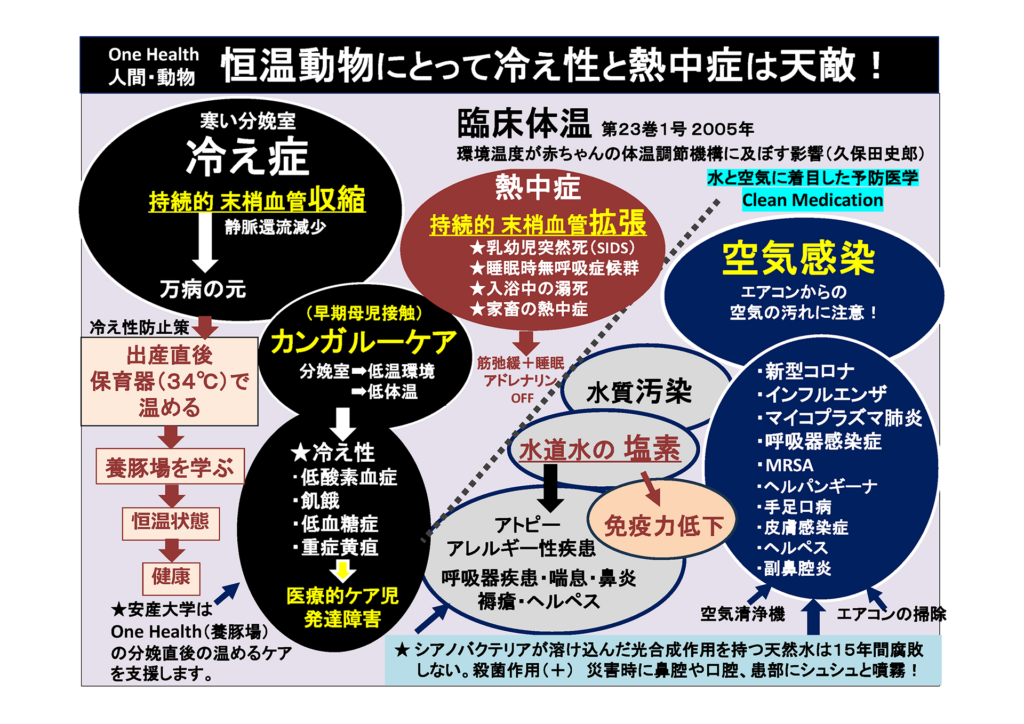 冷えと熱中症を「個人の体調管理問題」から「環境政策課題」へと再定義すること。それがワンヘルスの理念を実体化し、未来の疾病負担を減らすための現実的な第一歩です。体温管理は補助的テーマではなく、周産期から環境因子に介入する一次予防医療の基盤政策です。