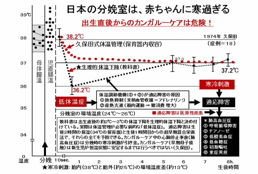 産科学教科書はこの低体温症を病気ではなく生理的現象と定義しているために、産科医・助産師は低体温の赤ちゃんを積極的に温めようとしません。