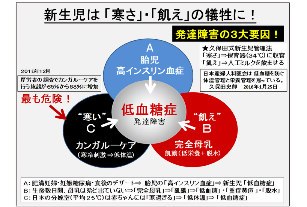 出生直後の赤ちゃんを恒温状態に早く安定する管理(先制医療)を行えば、低血糖症・重症黄疸は殆ど出なくなり発達障害を防げるのです。