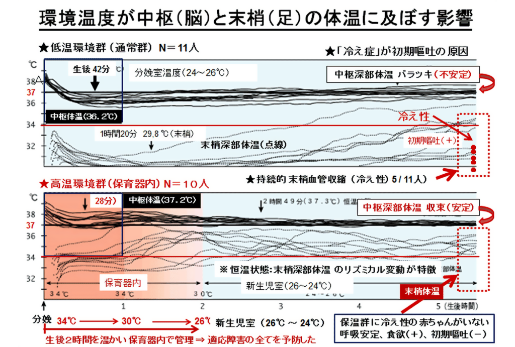 寒い分娩室に生まれた冷え性の赤ちゃんは、消化管の血流が悪く、食欲がなく、飲んでも嘔吐し、胎便の排泄が遅れ、重症黄疸の原因になります。