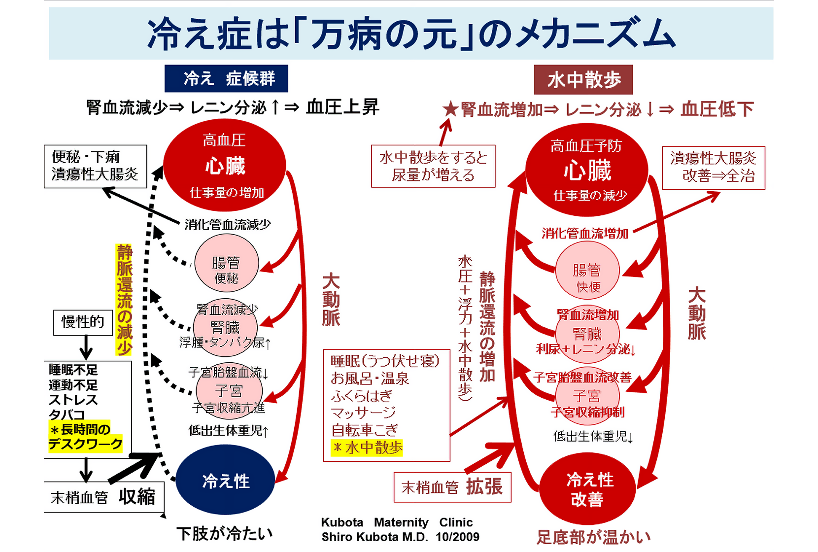 妊婦の「水中散歩」は冷え性の予防と治療に著しい効果を発揮する事を先の学会で発表しましたが、水中散歩に参加された妊婦さんには妊娠高血圧症・胎盤早期剥離は殆んど出ません。