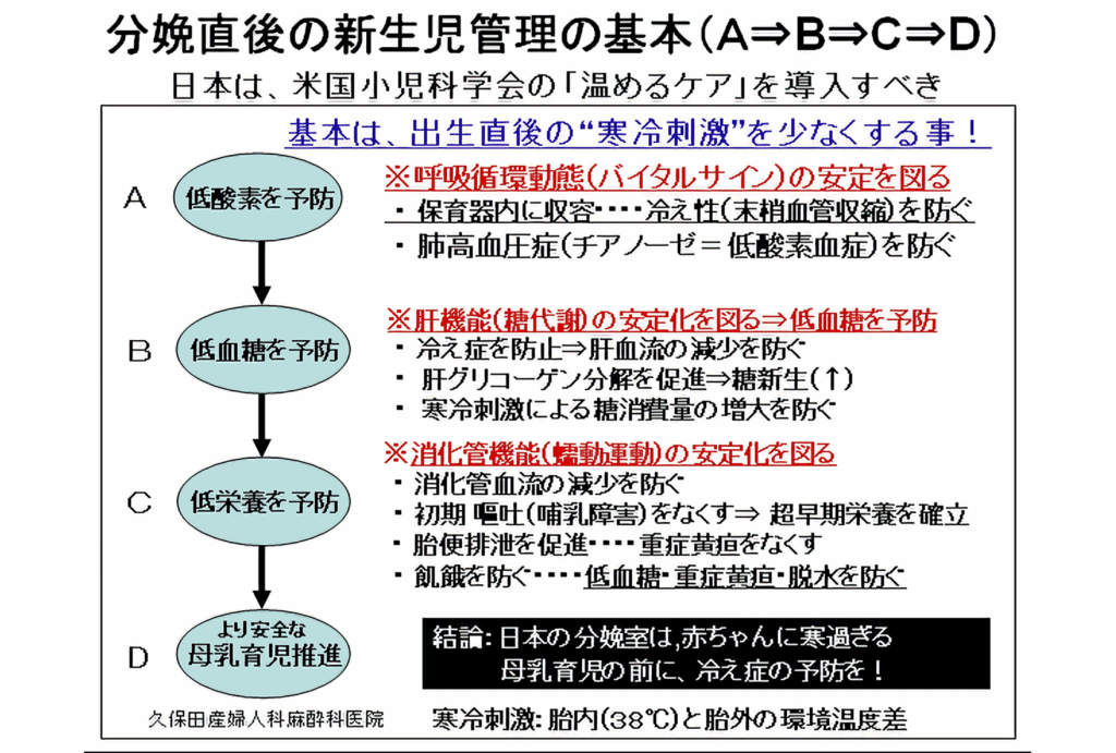現在のような出生直後の児をそのまま何時間も母親に「抱っこ」させるカンガルーケアのやり方は改めるべきだと考えています。