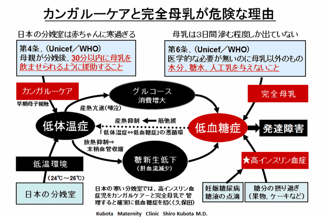 そのために母乳育児の3点セット(カンガルーケア+完全母乳+母子同室)が日本のお産の常識となり、脳に障害を与える低血糖症・重症黄疸・飢餓(体重減少)に陥る赤ちゃんを増やしているのです。