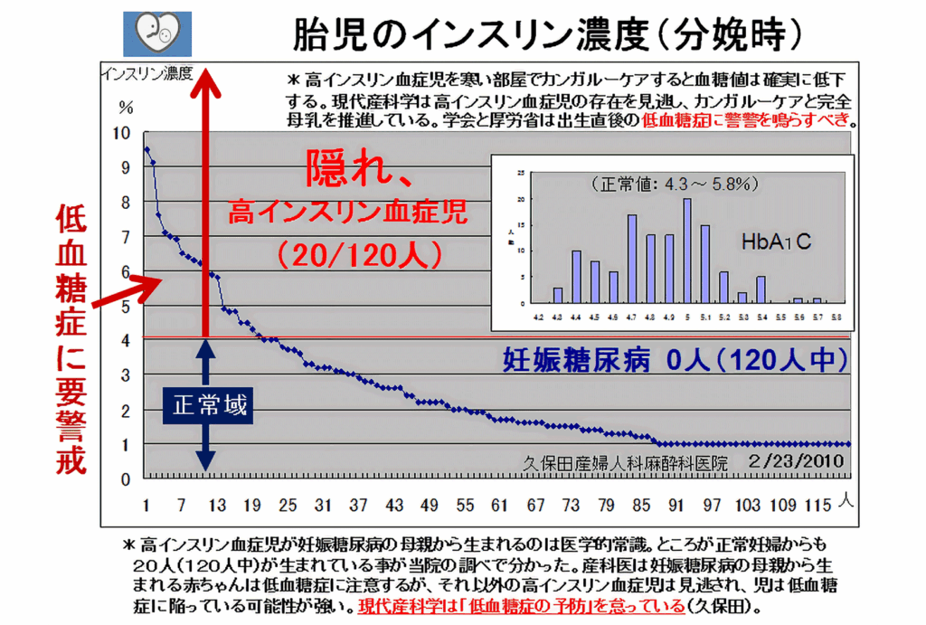 妊娠糖尿病の母親からは高インスリン血症児が生まれやすいのですが、我々のデータからは正常と思われた妊婦から生まれた児の何と6人に1人が高インスリン血症児でした。